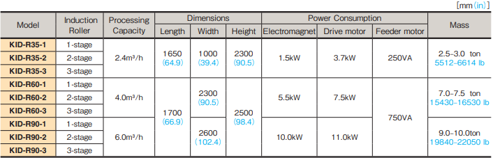 The amount to process is about 200 kg/h to 1000 kg/h per induction roller width 100 mm, though it varies according to kinds and grain sizes of substances to separate and required level of separation.