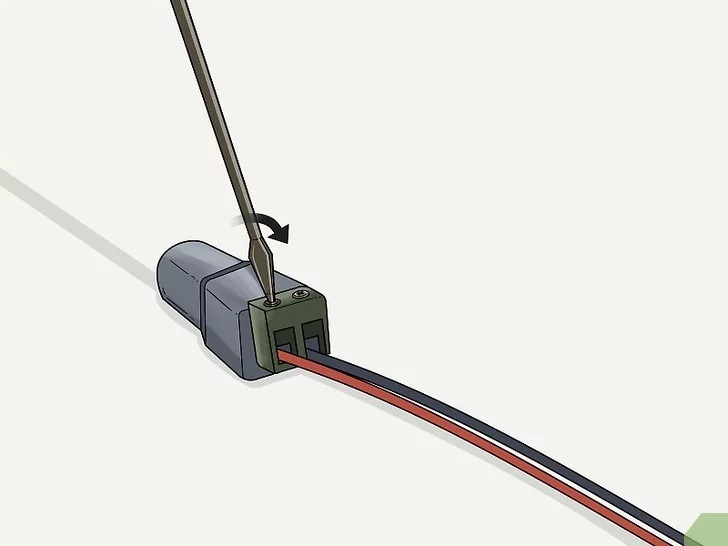 6. Đấu nối dây điện của đầu nối nhanh với dây cùng màu trên nguồn điện. Bạn có thể mua thiết bị đầu cuối dành cho đèn LED ở các cửa hàng đồ điện. Cắm các dây điện vào thiết bị đầu cuối rồi siết ốc theo chiều kim đồng hồ để cố định dây điện. Cắm các dây điện nguồn vào phía bên kia của thiết bị đầu cuối.