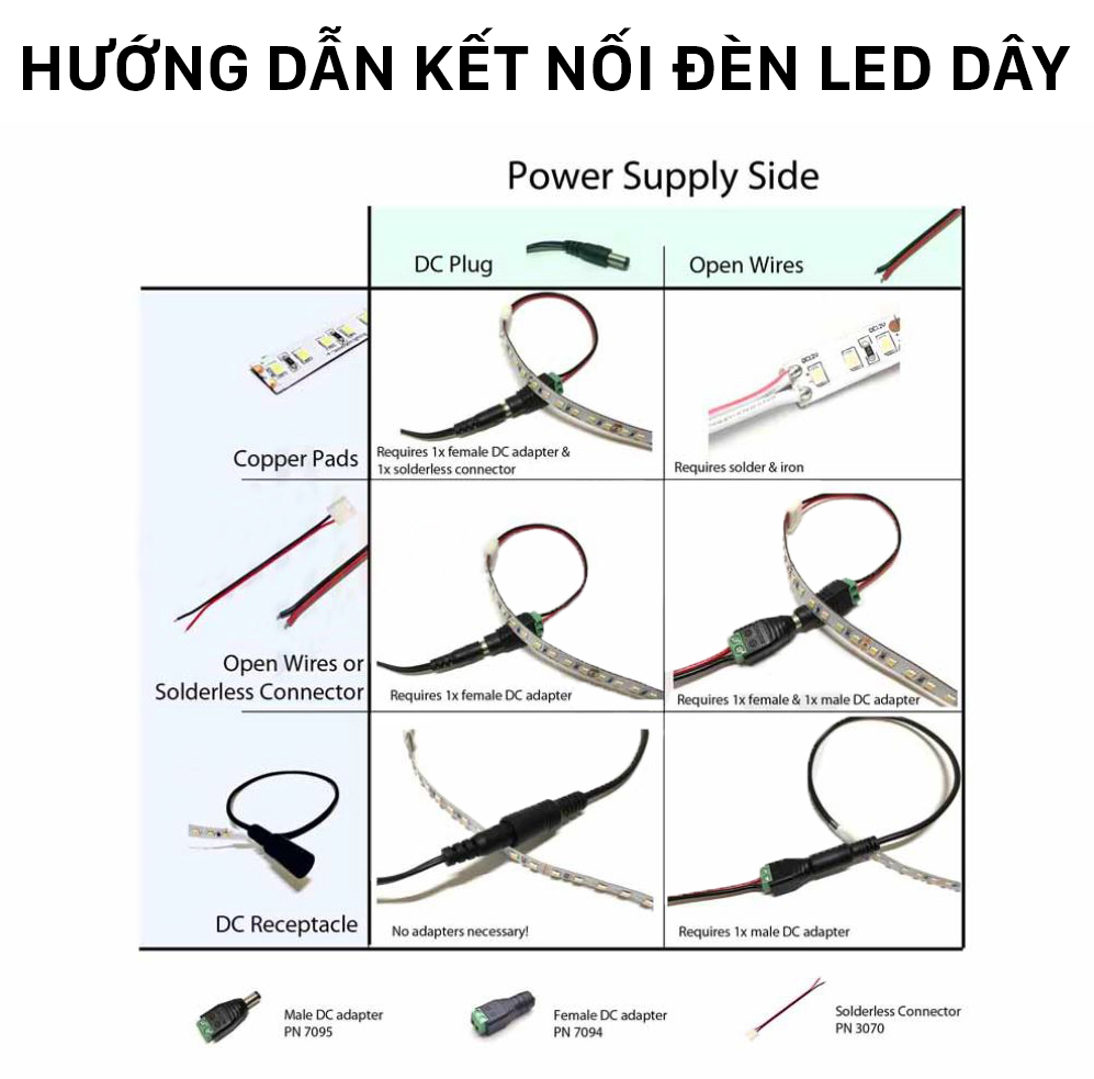 Mỗi đoạn LED dây cần kết nối với nguồn điện một chiều hoặc một đoạn LED khác được kết nối với nguồn điện một chiều. Phương thức kết nối sẽ phụ thuộc vào loại dây hoặc phích cắm được cung cấp cùng với đèn LED. Nếu bạn có thể tự hàn các mối nối trên đèn sẽ hiệu quả hơn về mặt thẩm mỹ cũng như chi phí.