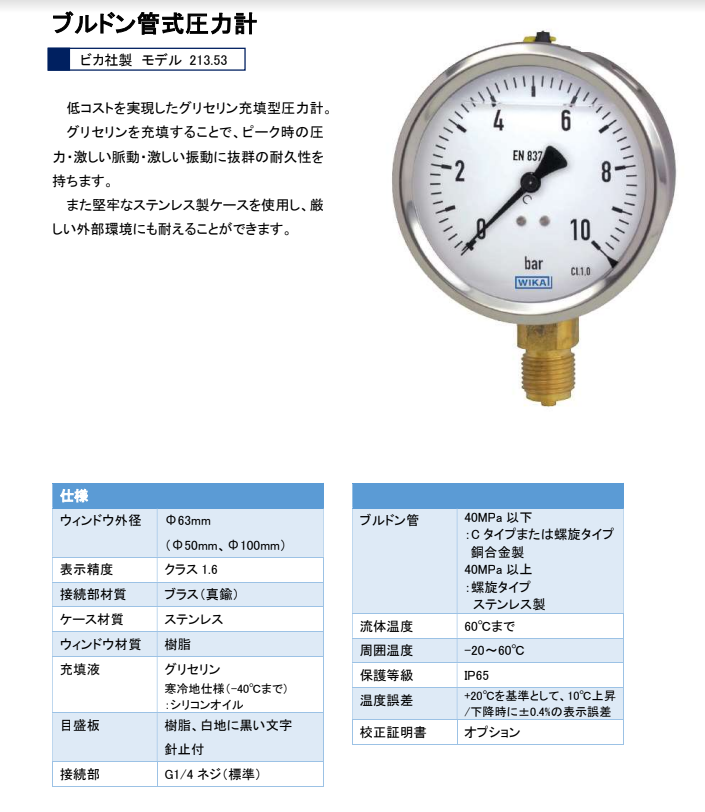 Đồng hồ đo áp suất Wika 213.53-63-10 - G1/4, dải đo 0-10 Bar, mặt