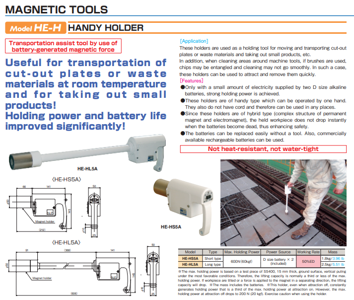 Những giá đỡ này được sử dụng như một công cụ giữ để di chuyển và vận chuyển các tấm đã cắt hoặc vật liệu phế thải và lấy các sản phẩm nhỏ ra, v.v. Ngoài ra, khi vệ sinh các khu vực xung quanh máy công cụ, nếu sử dụng bàn chải, các phoi bào có thể bị vướng vào và việc vệ sinh có thể không suôn sẻ. Trong trường hợp như vậy, những dụng cụ này có thể được sử dụng để thu hút và loại bỏ chúng một cách nhanh chóng