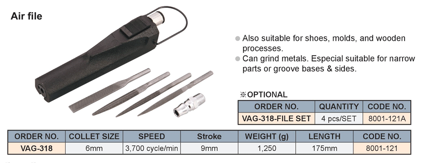 Ứng dụng: Máy giũa khí nén VAG-318 được dùng để sửa khuôn, chi tiết gỗ, đánh giầy và chi tiết chật hẹp hoặc các bề mặt, đế có rãnh.Tra dầu bôi trơn #60.