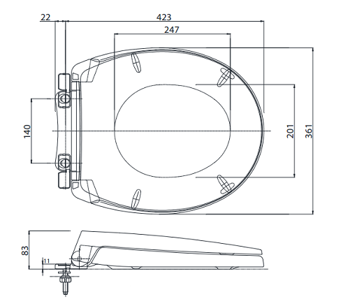 Nắp bồn cầu đóng rơi êm, kích thước nắp đậy 42x36cm, khoảng cách giữa 2 tâm ốc 14-16 cm