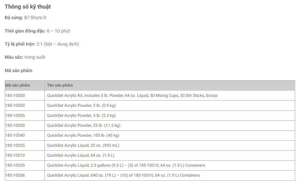 QuickSet Acrylic là sản phẩm có tốc độ đông cứng nhanh nhất trong các loại dung dịch đúc mẫu nguộicủa Allied High Tech. Tốc độ đông đặc của khuôn chỉ trong vòng 6 – 8 phút tuy nhiên nhiệt độ sinh ra trong quá trình đông sẽ hơi cao hơn so với các loại dung dịch đúc mẫu nguội khác. Thường được sử dụng cho các vật mẫu bằng kim loại hoặc các bảng mạch in và linh kiện điện tử khác